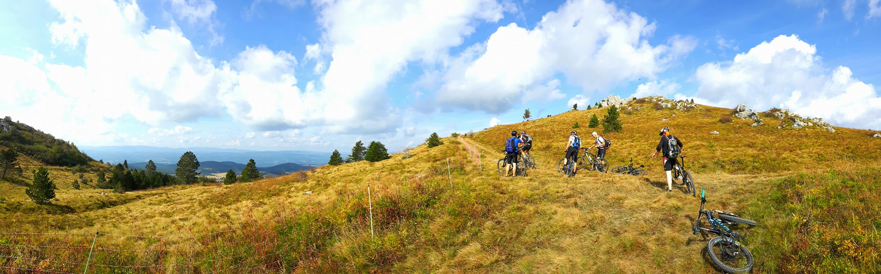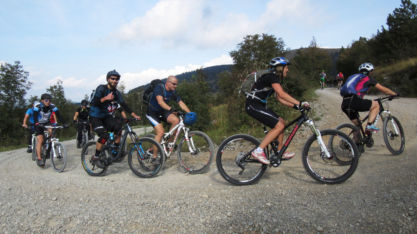 Po okrepčilu, uživanju razgledov, obveznem fotografiranju in odtisu za mnoge prvega žiga v Dnevniku STKP (hvala Jocu, ki je poskrbel za ustrezno količino novih dnevnikov), smo se najprej spustili preko travnate planote vzdolž linije bunkerjev Alpskega zidu, zatem pa nadaljevali po makadamski cesti nad Mrzlim dolom, vse do Bistriške bajte v križišču z asfaltno cesto Ilirska Bistrica–Sviščaki. Cesto smo zgolj prečkali, nato pa je sledil resnično lep spust mimo Štange in Kozleka v vasico Jasen, ki je potekal po razgibanih stezicah in vlakah, katere so nam odkrili in pripravili prizadevni ilirskobistriški gorski kolesarji! Kot so nam zaupali, se tudi sami lotevajo vzpostavitve turnokolesarskega odseka pri PD Snežnik Ilirska Bistrica, pa tudi sicer je kolesarstvo kot turistični produkt z velikim zelenim potencialom vedno bolj prisotno v teh krajih.