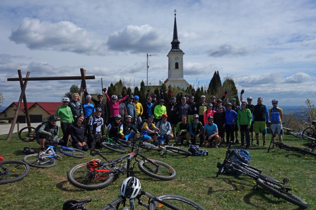Številčna turnokolesarska zasedba iz vse Slovenije pri cerkvici sv. Urbana, na najvišji točki ture (foto Simon Berlec)