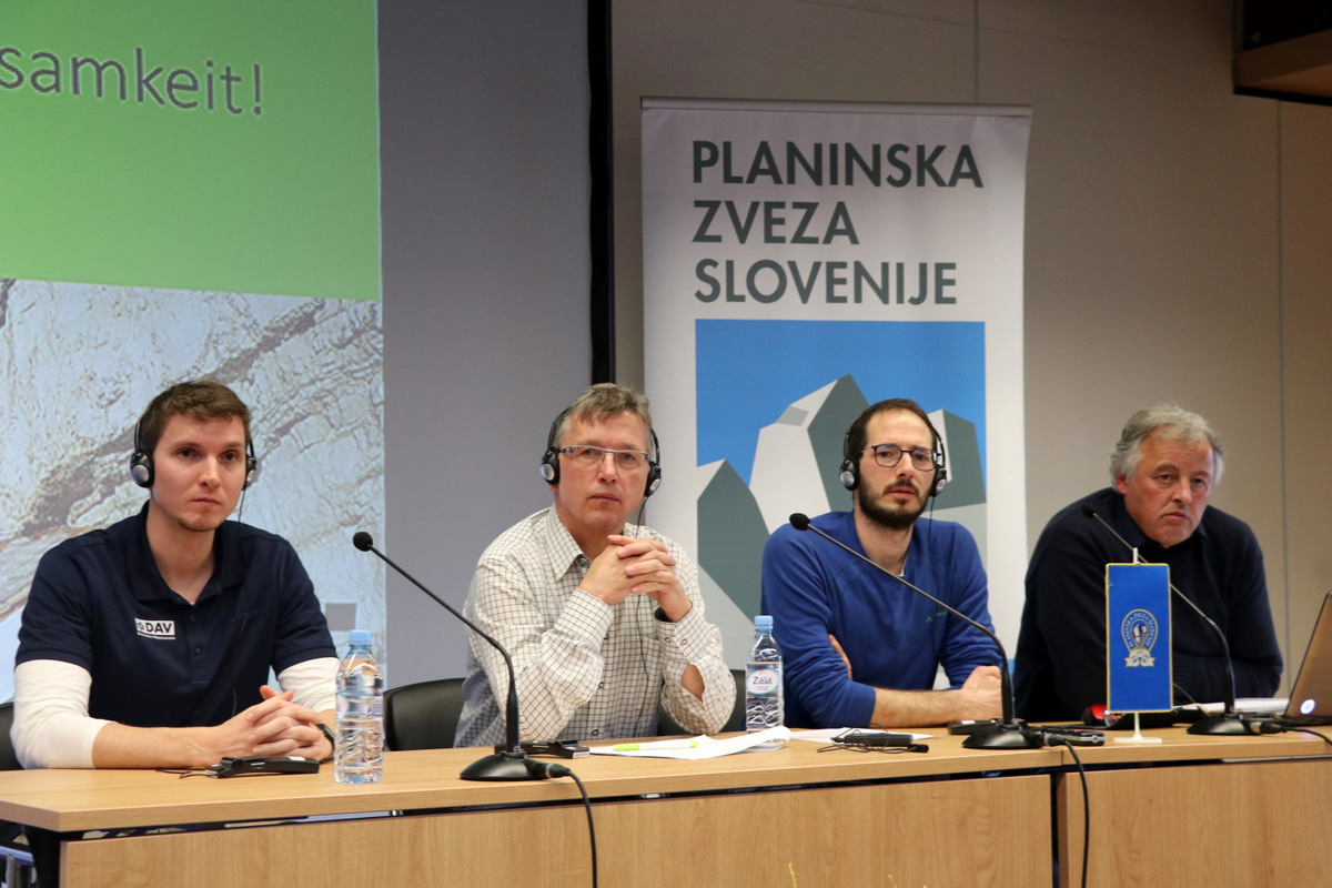 Nicolas Gareis (DAV), Peter Angermann (ÖAV), Martin Niedrist (AVS) in Miro Eržen (PZS) na mednarodnem posvetu o planinski infrastrukturi (foto Manca Čujež)