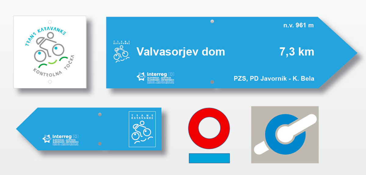 dvonamenske markacije in usmerjevalne table z znakom Trans Karavanke,