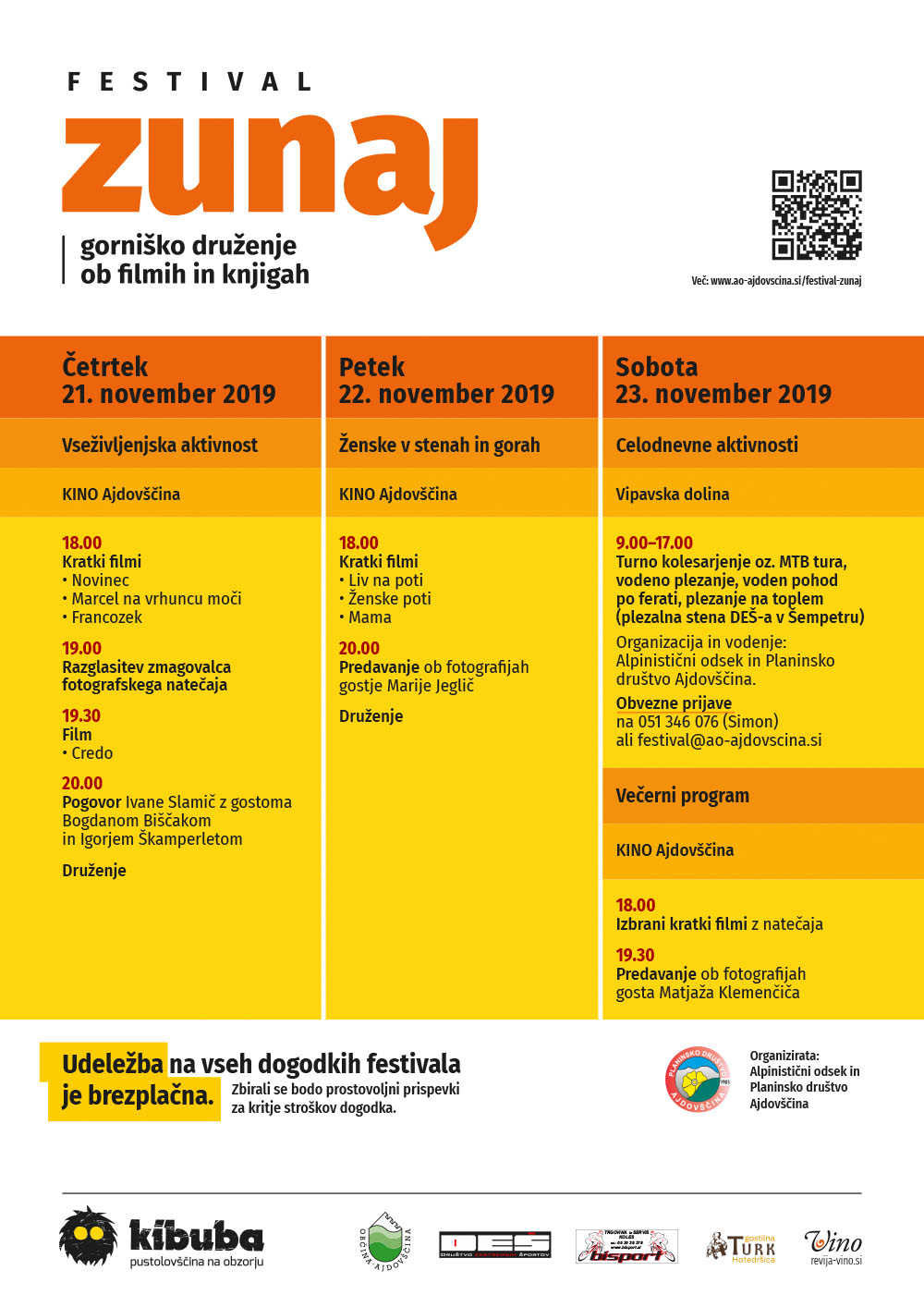 AO Ajdovščina in PD Ajdovščina vabita vse ljubitelje gora na Festival ZUNAJ, ki bo potekal med četrtkom, 21. novembra 2019, in soboto, 23. novembra 2019, v Ajdovščini (Kino).