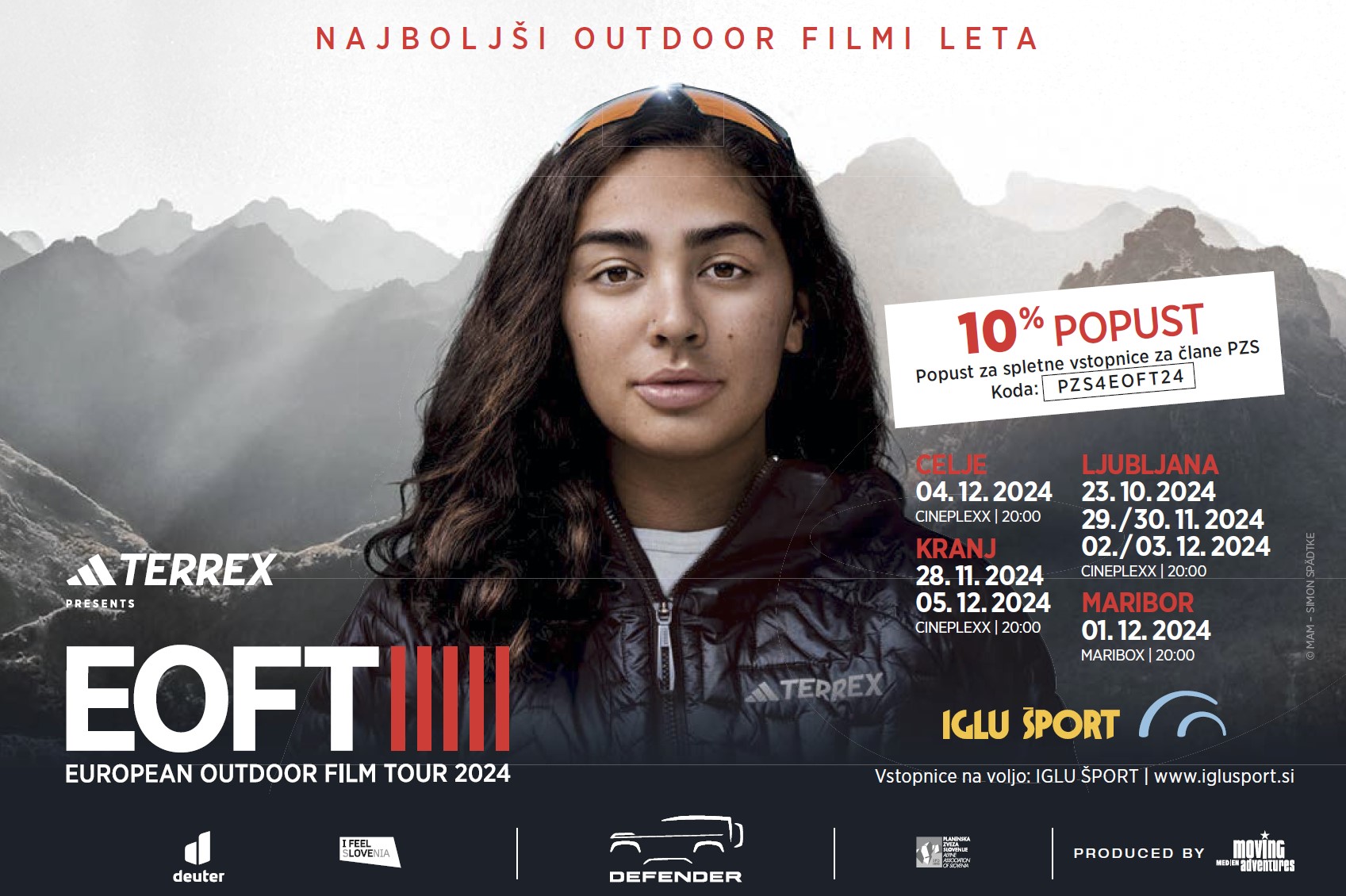 Filmski festival European Outdoor Film Tour (E.O.F.T.) oktobra začenja jesensko evropsko turnejo s šestimi filmskimi pustolovščinami na velikem platnu. Oktobra, novembra in decembra bo tudi v Sloveniji devet predstav, in sicer pet v Ljubljani, dve v Kranju ter po ena v Mariboru in Celju. Pri nakupu spletnih vstopnic lahko izkoristite 10-odstotni popust za člane PZS.